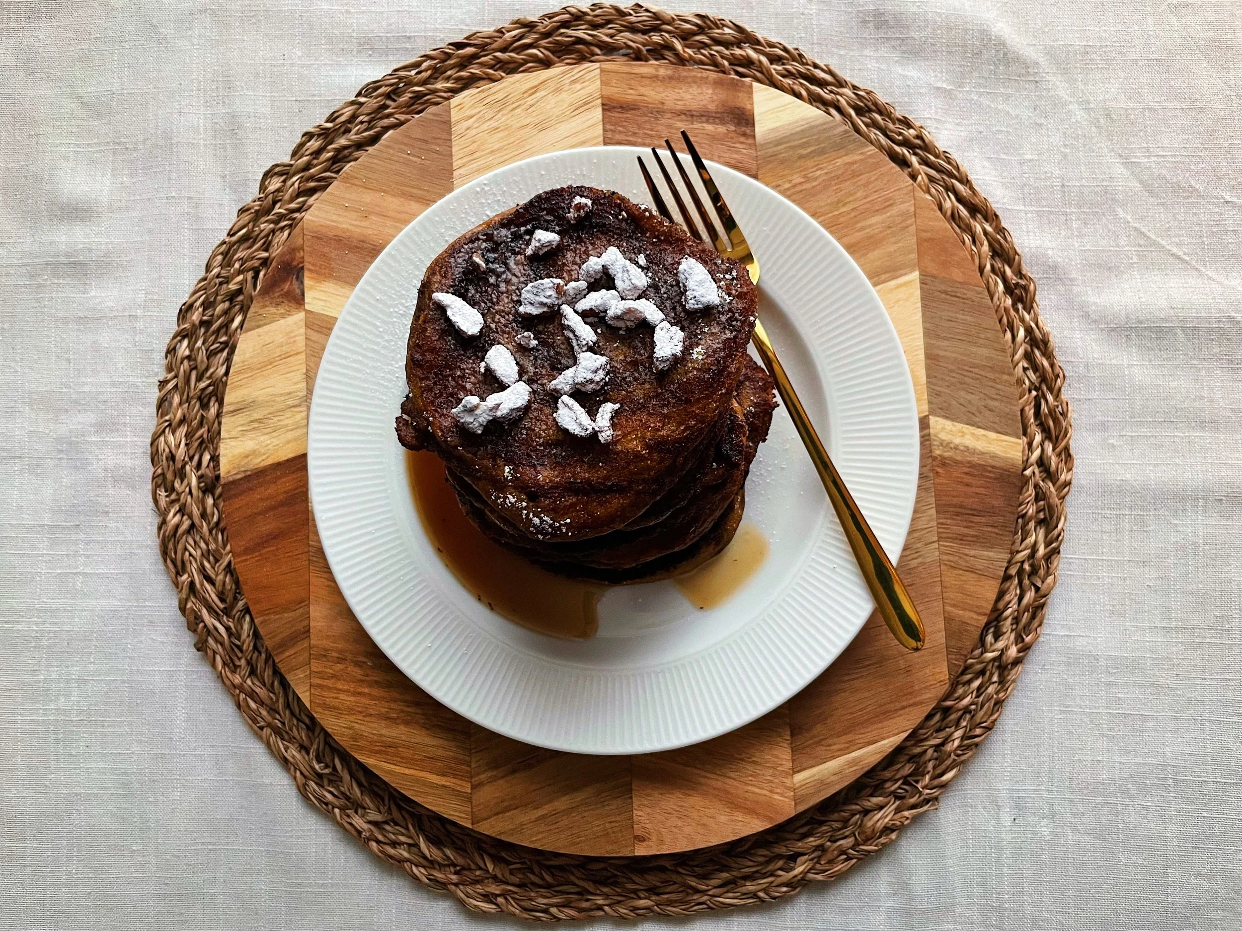 I take a large pan, put it on high heat, and add enough butter to coat the bottom. Once it’s sizzling, I pour in about half a ladle-full of the batter per pancake. I smooth down the top with a spatula, pipe a cinnamon sugar swirl on top (optional), and bring the heat down to a medium flame. I cook the pancakes for 3 minutes, bring the heat down further, and then carefully flip them over, swirl side down for 2 minutes. I then flip them over once again and cook for another 1 minute, swirl side up. This should create some nice caramelisation on the outside, leaving the pancakes soft and fluffy on the inside.